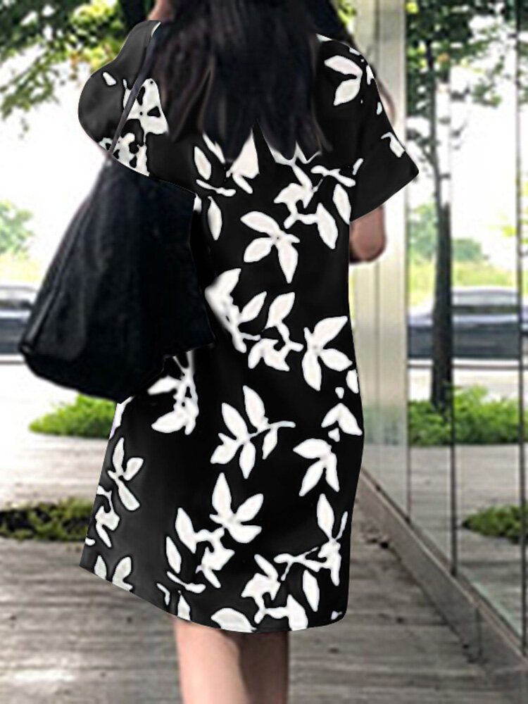 Bladtrykk Kortermet Kjole Med Rund Hals