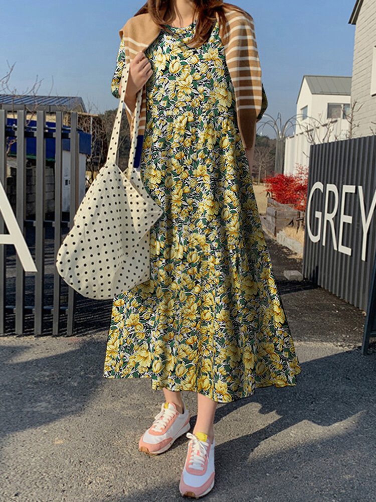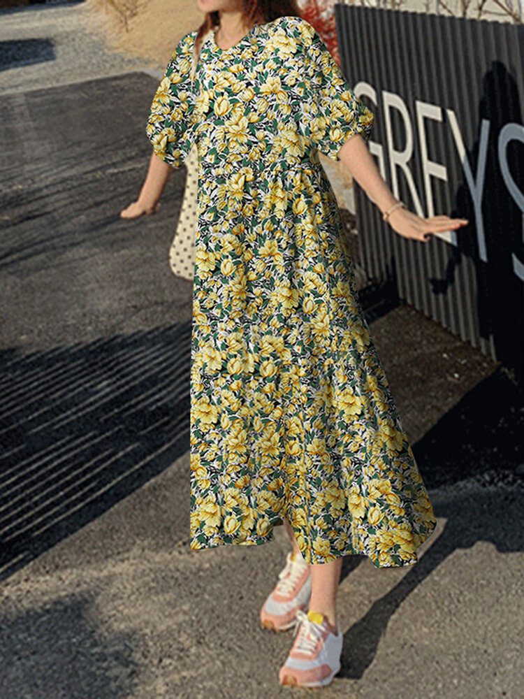 Blomstertrykk Halvermet Løs Kjole Med O-hals
