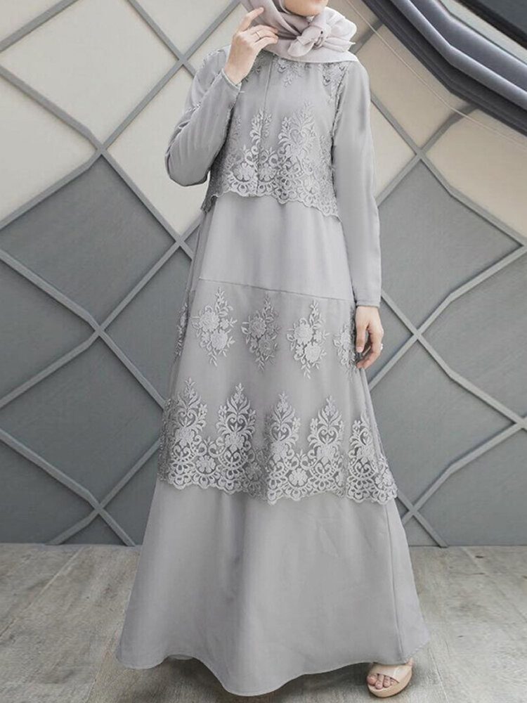 Blondesøm A-linje O-hals Ensfarget Langermet Muslimsk Kjole Abaya Kaftan For Kvinner