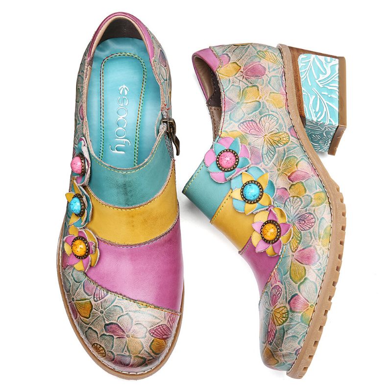 Bohemian Bloom Polykromatisk Pregede Blomsterspleising Blomsterpumper I Ekte Skinn
