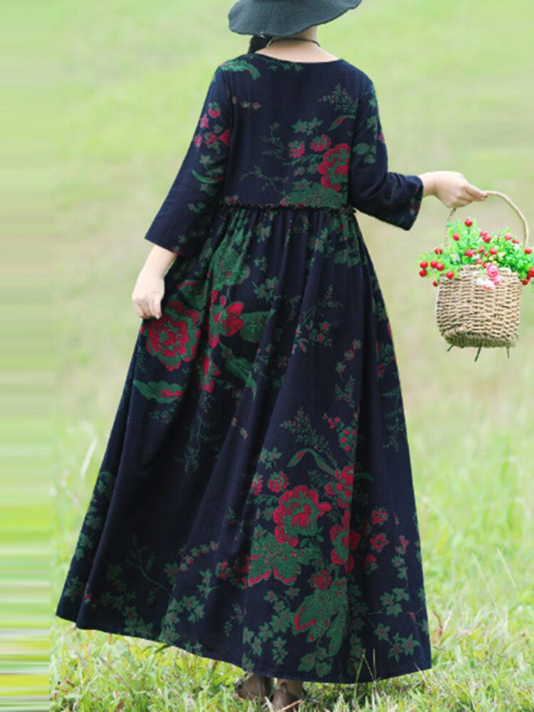 Bohemian Floral Printed Volanger Med Sidelommer Løs Maxikjole