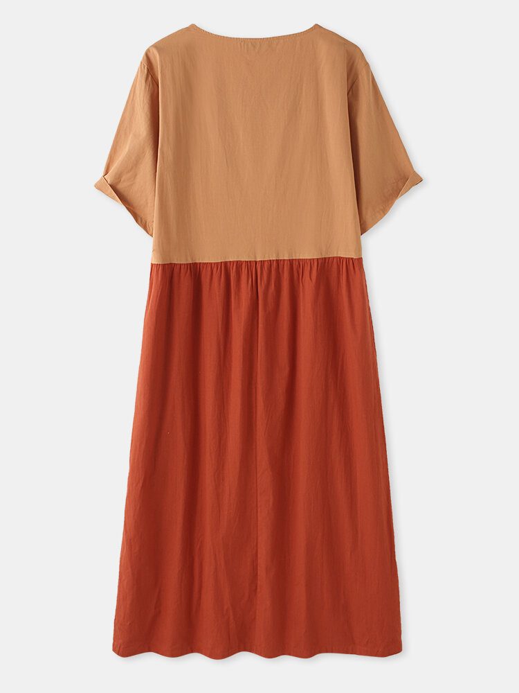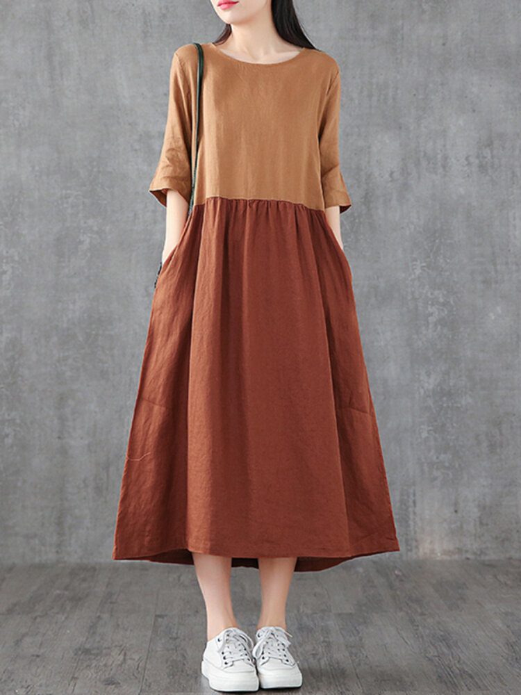 Casual Color Block Rundhalssøm Maxikjole Med Lomme