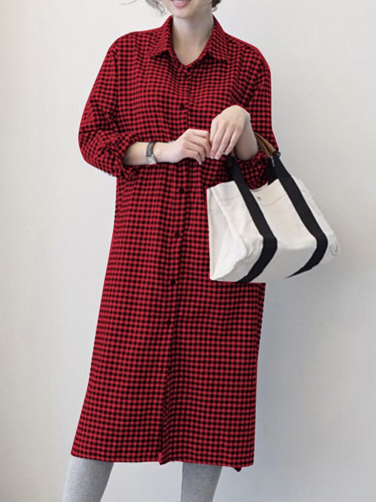 Check Print Lapel Langermet Button Down Skjortekjole