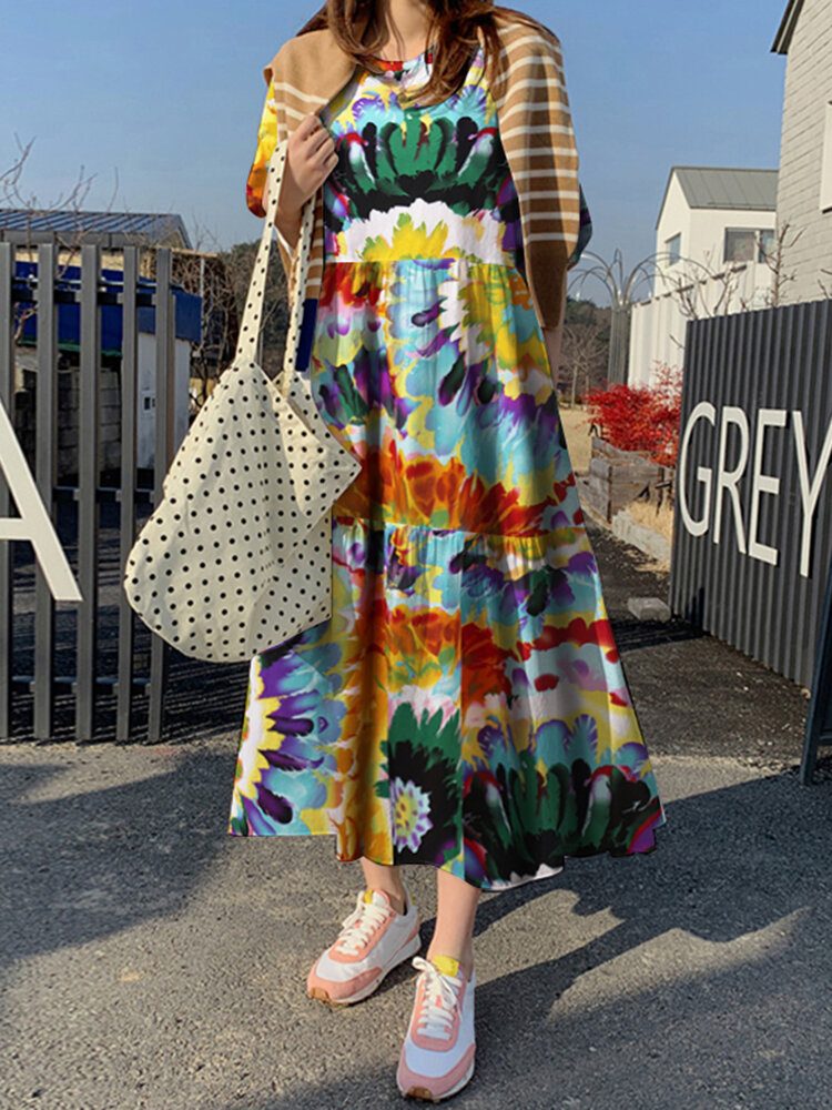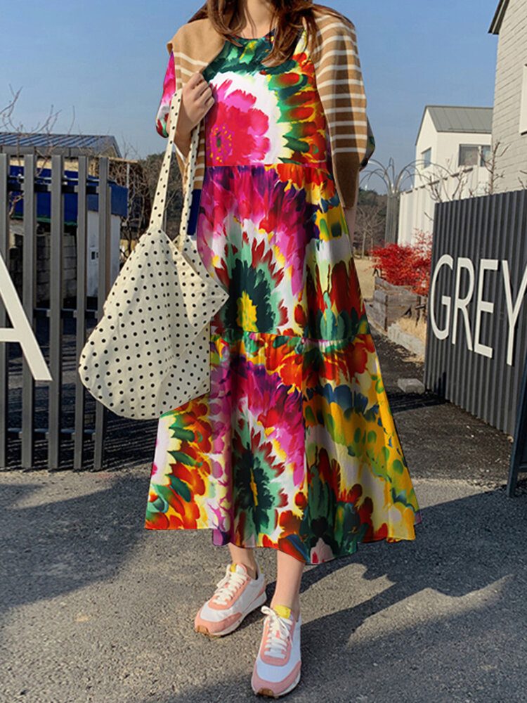 Cottagecore Flower Print Pocket Puff Sleeve Casual Maxi Dress