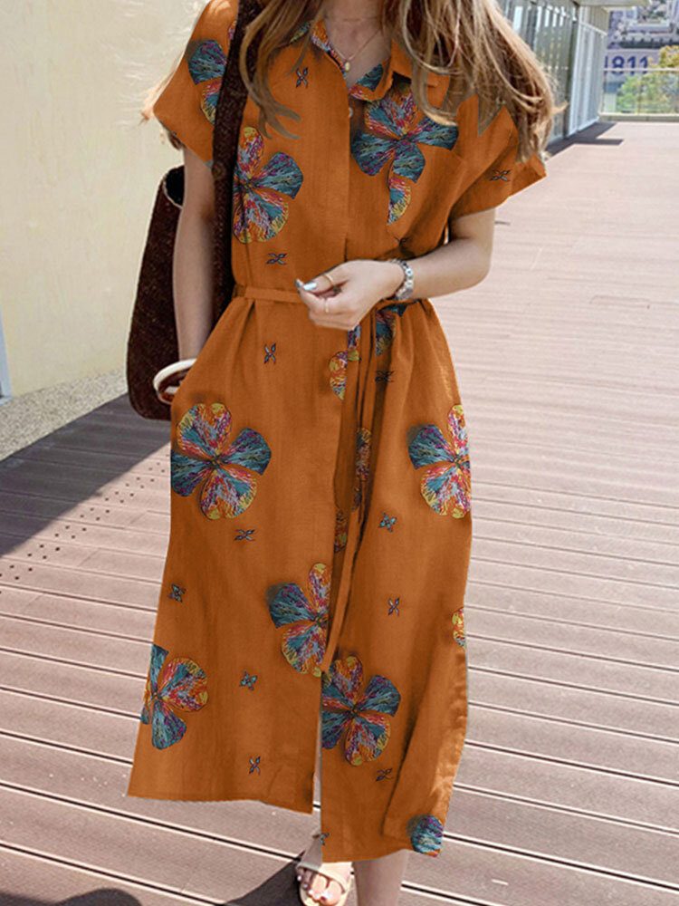 Cottagecore Plant Print Lommeknapper Kortermet Bomullsskjortekjole