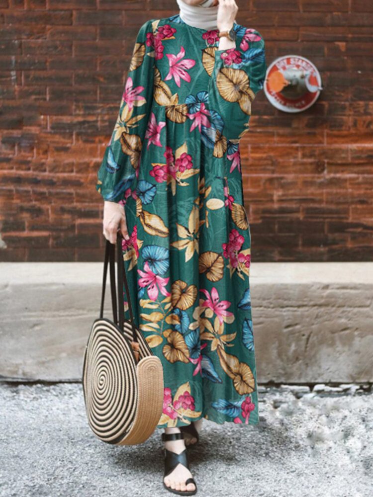 Dame Abaya Kaftan Puff Sleeve Floral Bohemian Ankellengde Kjole