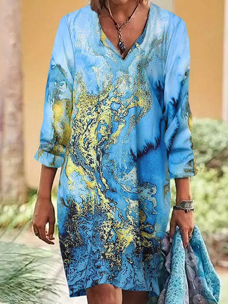 Dame Bohemian Retro Canva Printed Knelengde Midi-kjoler Med V-hals