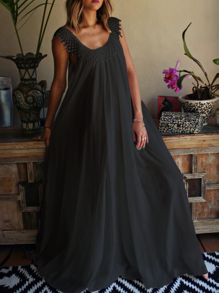 Dame Ensfarget Blonder Chiffon Patchwork Ermeløs Løs Gjennomsiktig Strand Casual Maxikjole