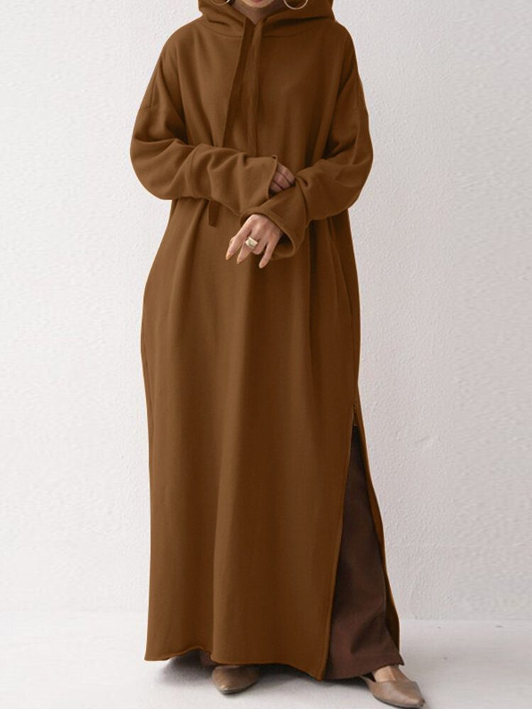 Dame Hette Delt Sideglidelåssøm Design Kjole Med Hel Ermer Med Lommer