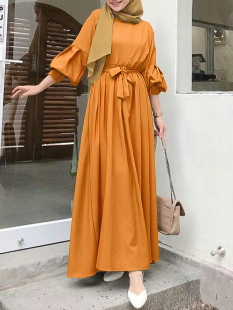 Dame Kaftan Tunika Latern Erme Midjebånd Ensfarget Midi-kjole