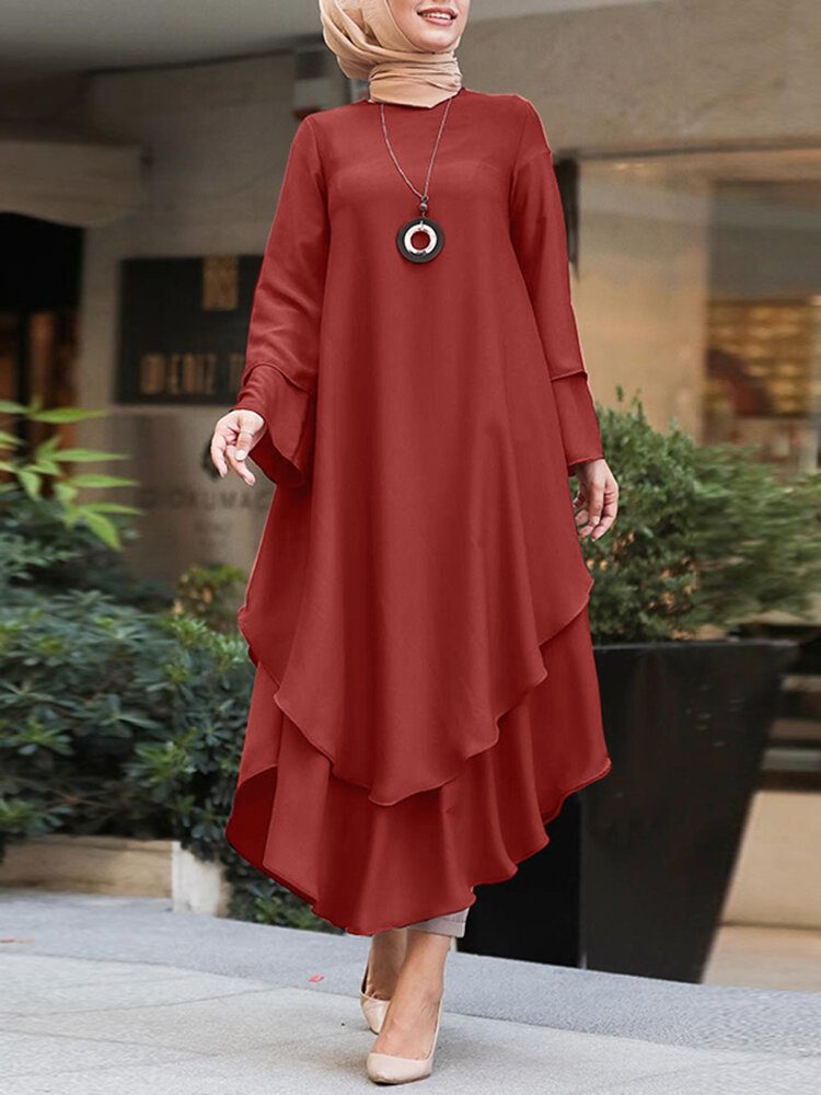 Dame Pure Color Layered Uregelmessig Hem Kaftan Casual Langermede Maxikjoler