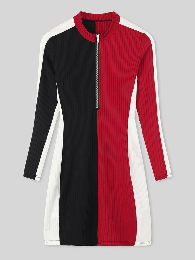 Dame Ribbet Patchowork Halv Glidelås Foran Langermet Elegant Kjole