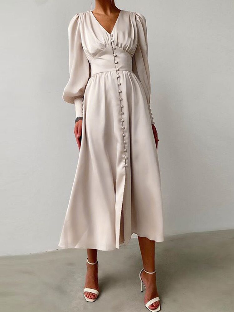 Dame Satin Button Up V-hals Langermet Elegante Maxikjoler