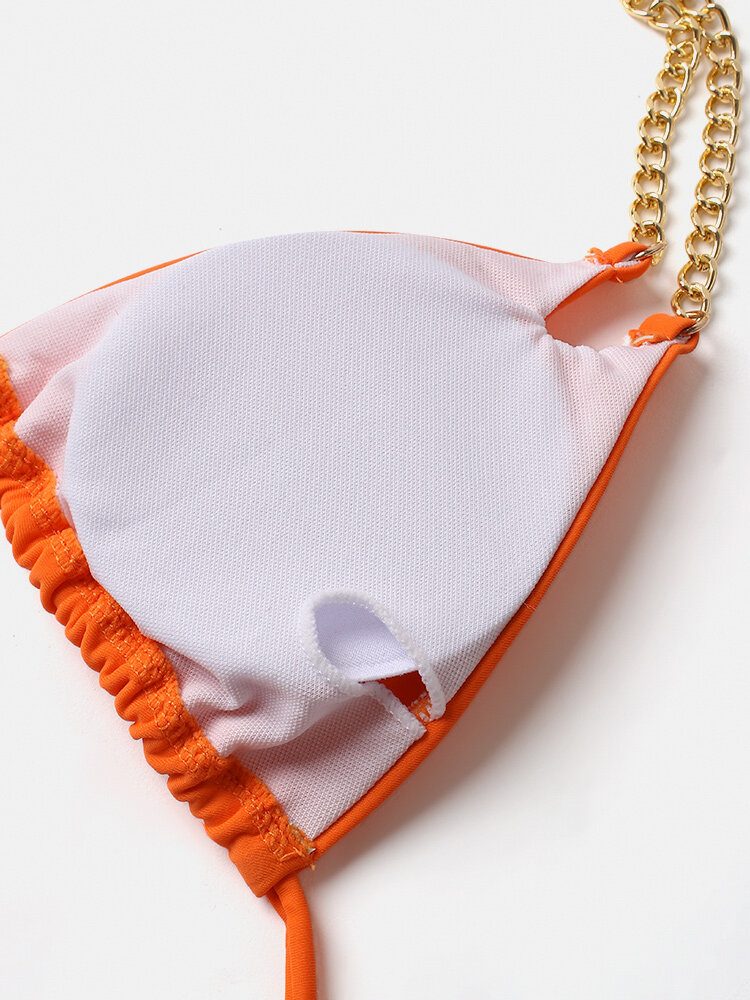 Dame Triangle Halter String Solid Color Chain Bikini Backless Badetøy