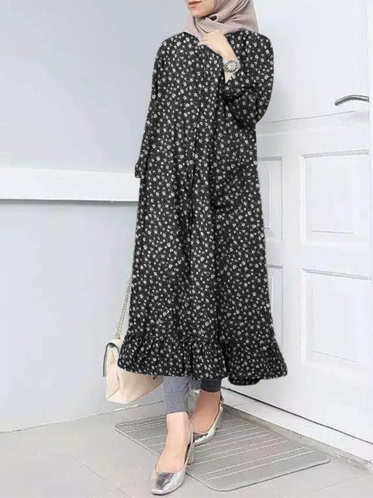 Ditsy Floral Button Ruffle Langermet Maxi Dress
