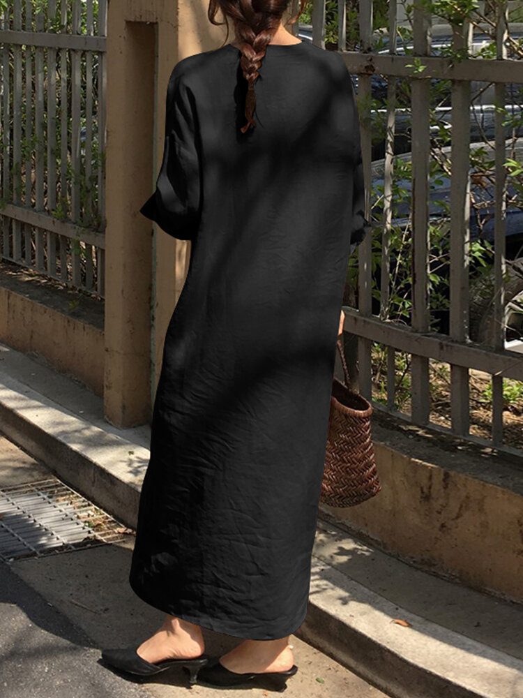 Ensfarget Langermet V-hals Løs Cotton Maxi Dress