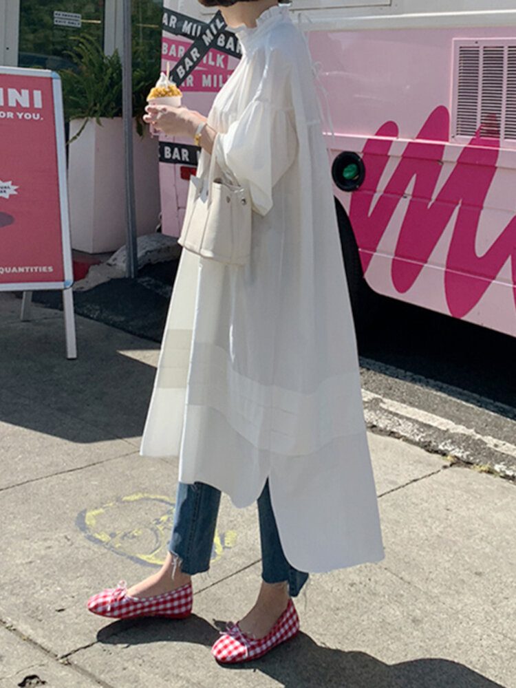 Ensfarget Puffermet Turtleneck Snøring Plisserte Sømmer Høy Lav Hem Skjortekjole