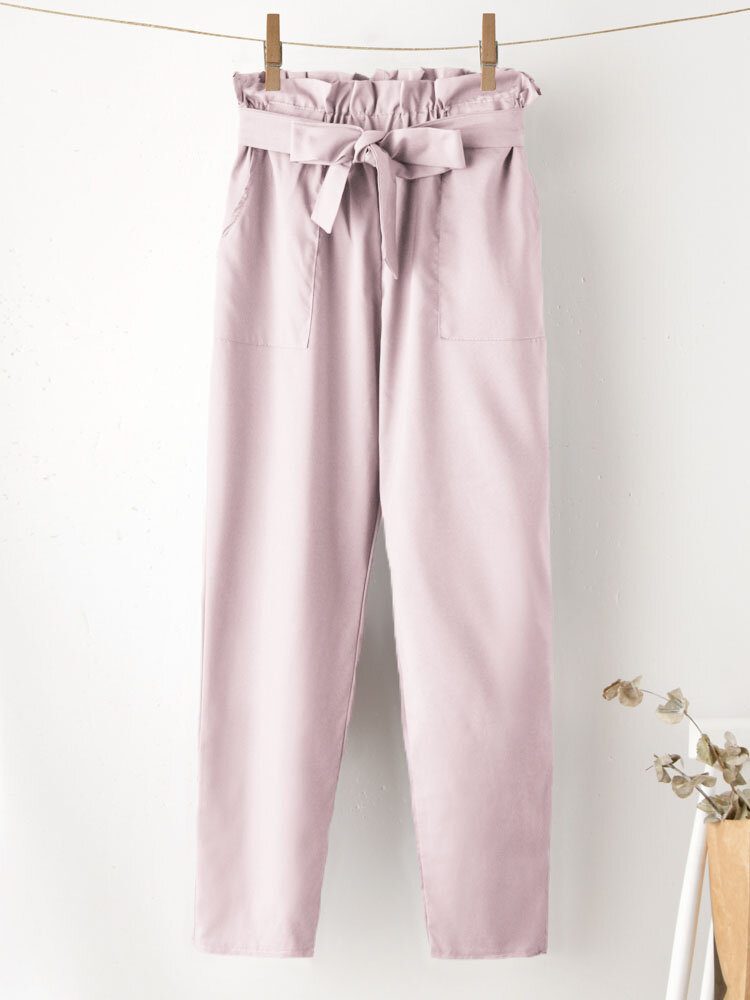 Ensfarget Ruffle Knoted Pocket Casual Cropped Bukser For Dame