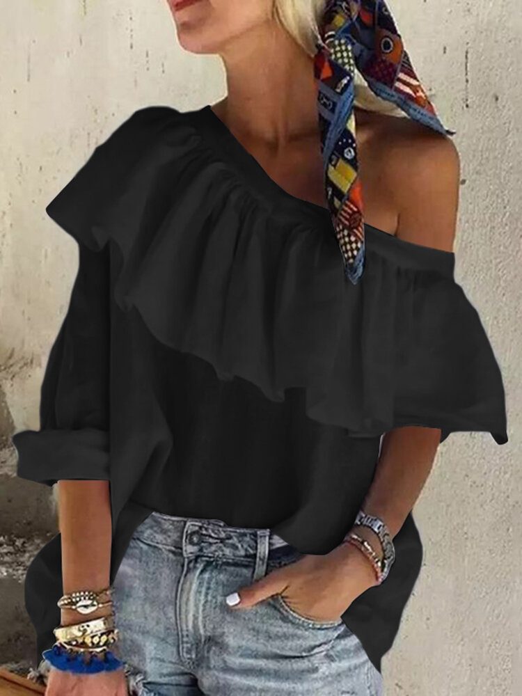 Ensfarget Volanger Uregelmessig En Skulder Holiday Daily Casual Bluse For Kvinner