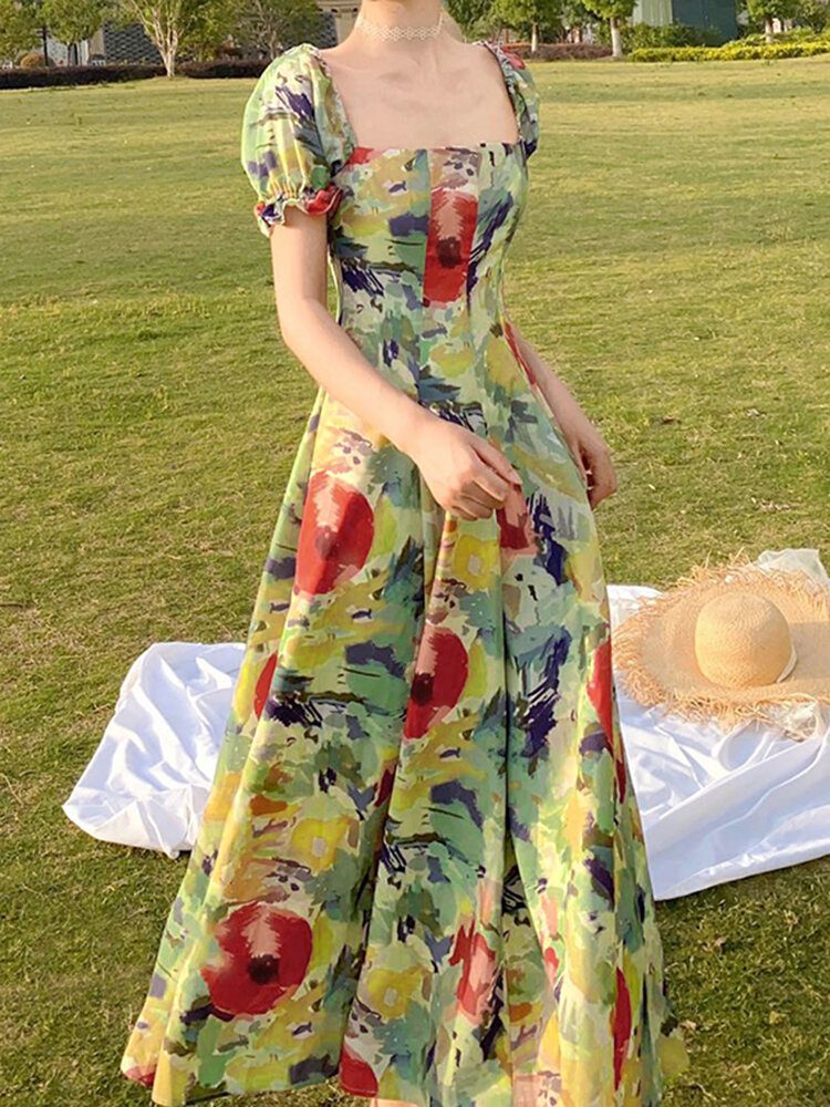 Floral Puff Sleeve Glidelås Plissert Maxikjole For Dame