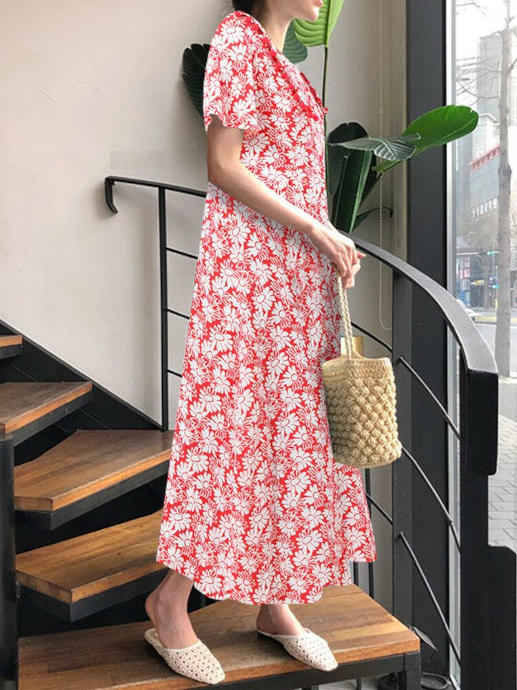 Fritid Kortermet Lapel Floral Løs Maxikjole For Dame