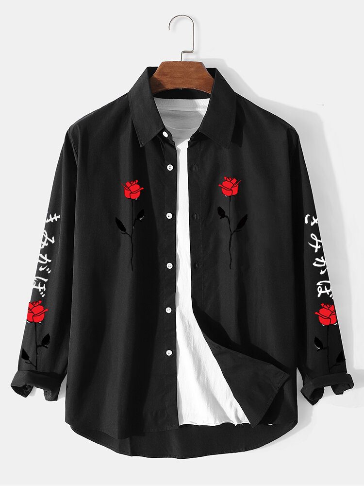 Herre Rosetrykt Japansk Brev Jakkeslagskrage Langermede Skjorter