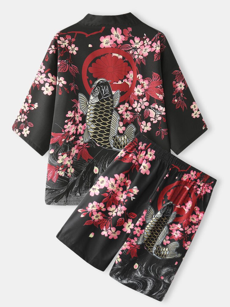 Kimono Karpe Blomstertrykk Japansk Fisk Elastisk Midje Todelt Antrekk