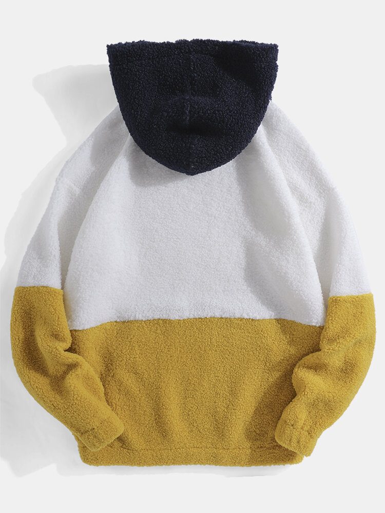 Kontrastfarge For Menn Patchwork Drop Shoulder Kangaroo Pocket Plysj Hettegensere