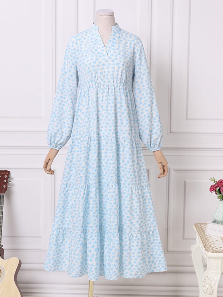 Kvinner Blomstret V-hals Løse Puffermer Plisser Langermet Casual Ankellengde Maxikjoler