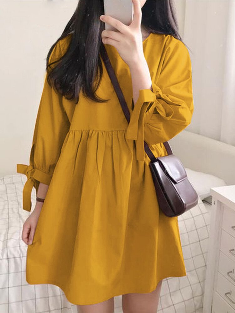 Kvinner Ensfarge Plissering Knyttet 3/4-ermet O-hals Uformell Daglig Løs Minikjole
