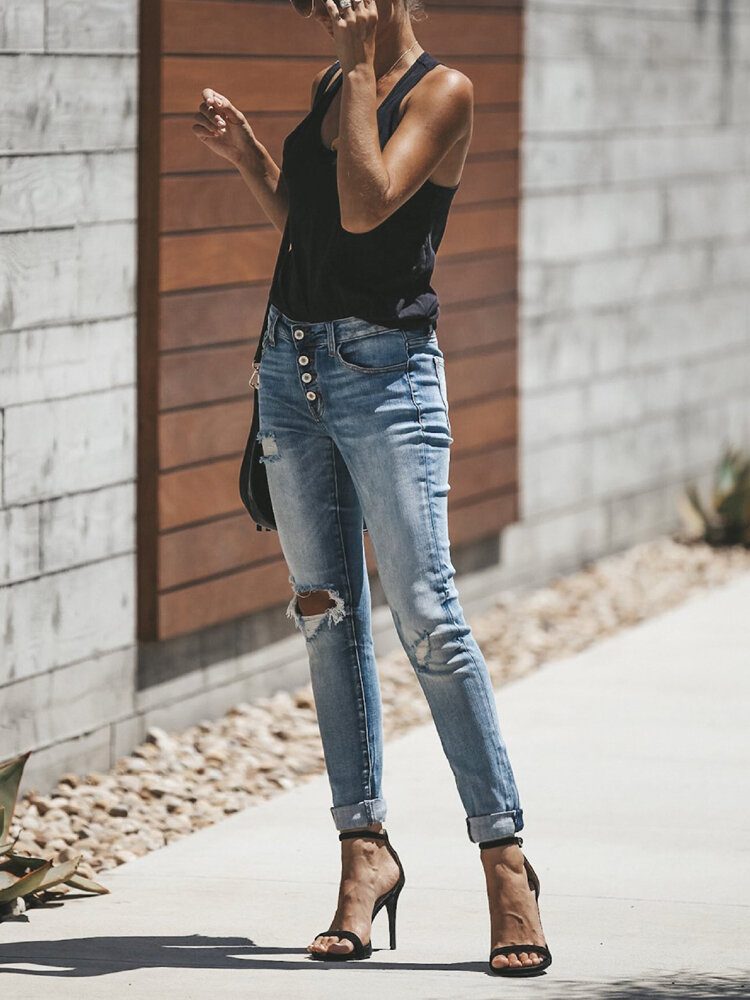 Kvinner Fritid Button Hollow Out Ripped Work Daily Casual Jeans