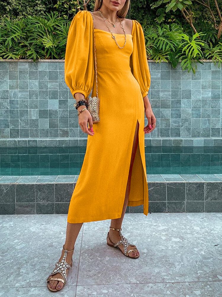 Kvinner Holiday Ensfarget Firkantet Krage Puff Erme Unilateral Split Maxi Dress
