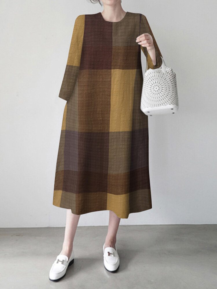 Kvinner Rutet Rygg Glidelås Sidelomme O-hals Midi-kjoler Midt På Legglengden