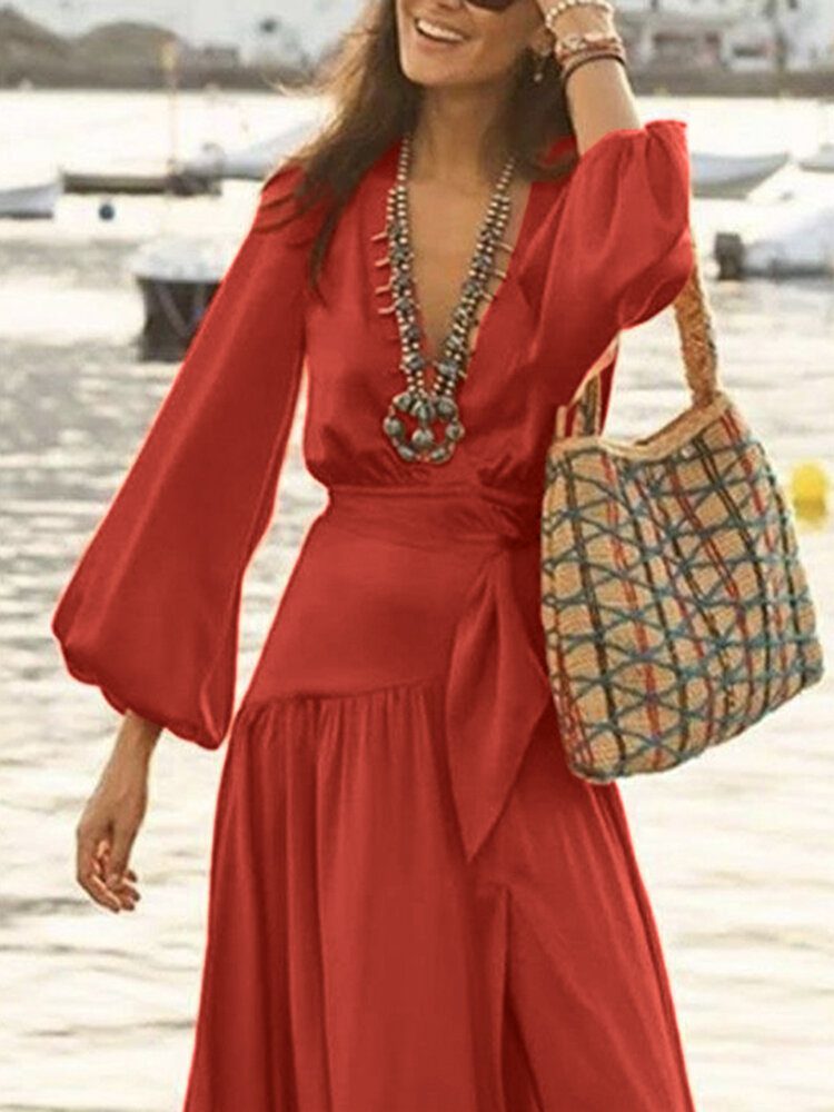 Kvinner Snøring Høy Delt V-hals Holiday Elegant Langermet Ensfarget Maxikjole