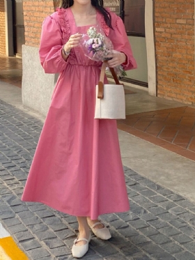 Kvinner Solid Rundhals Langermet Gul Plissert Minikjole
