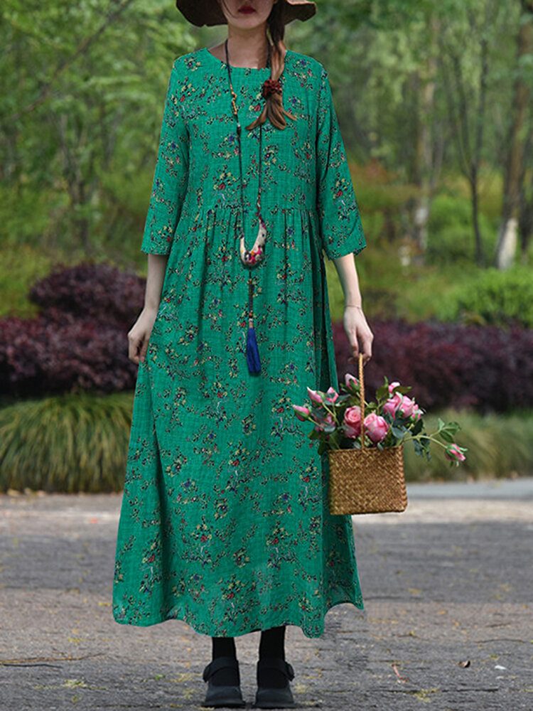 Kvinner Vintage Blomster Print O-hals 3/4-ermet Casual Holiday Maxi Dress