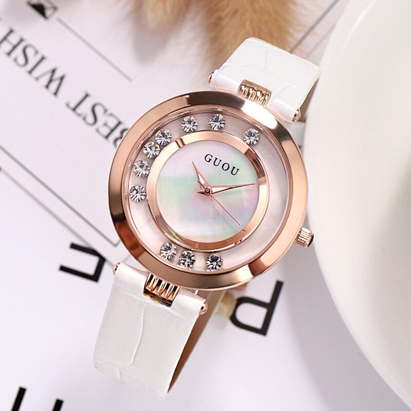 Mote Dame Klokke Lys Luksus Full Stål Glitter Diamant Lærreim Kvinne Kvarts Klokke