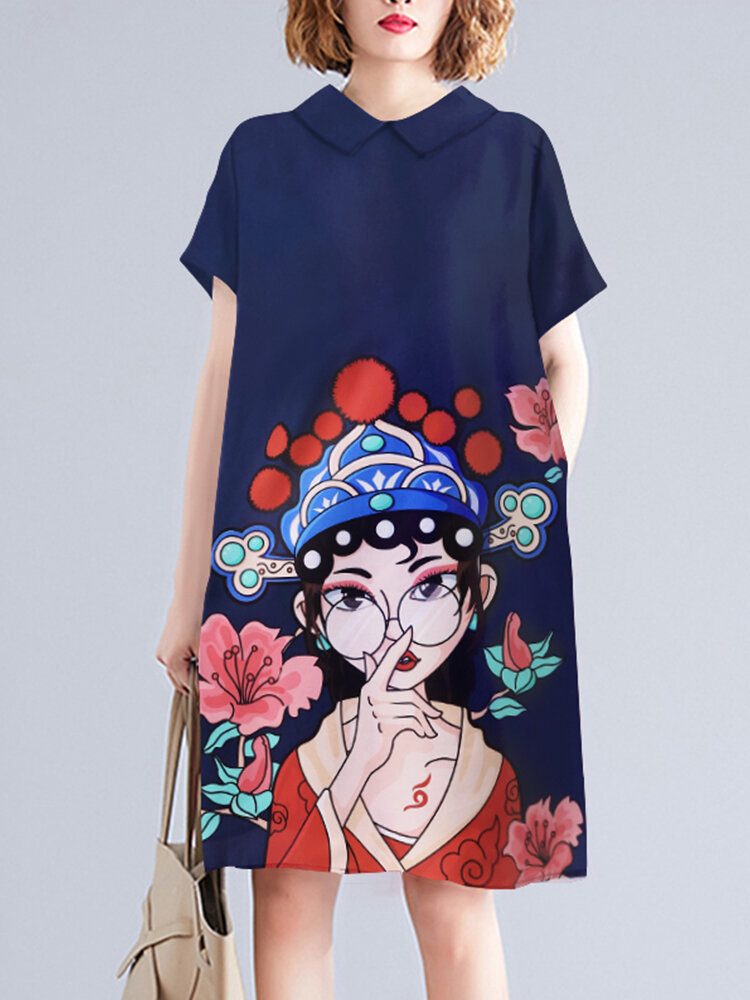 Peking Opera Mønster Lomme Kortermet Midi-kjole