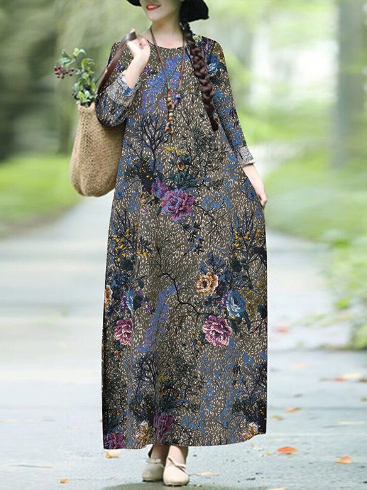 Plant Flower Print Rund Hals Langermet Casual Maxi Dress