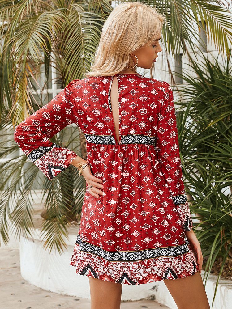 Print Etnisk Mønster Patchwork V-hals Langermet Midi-kjole