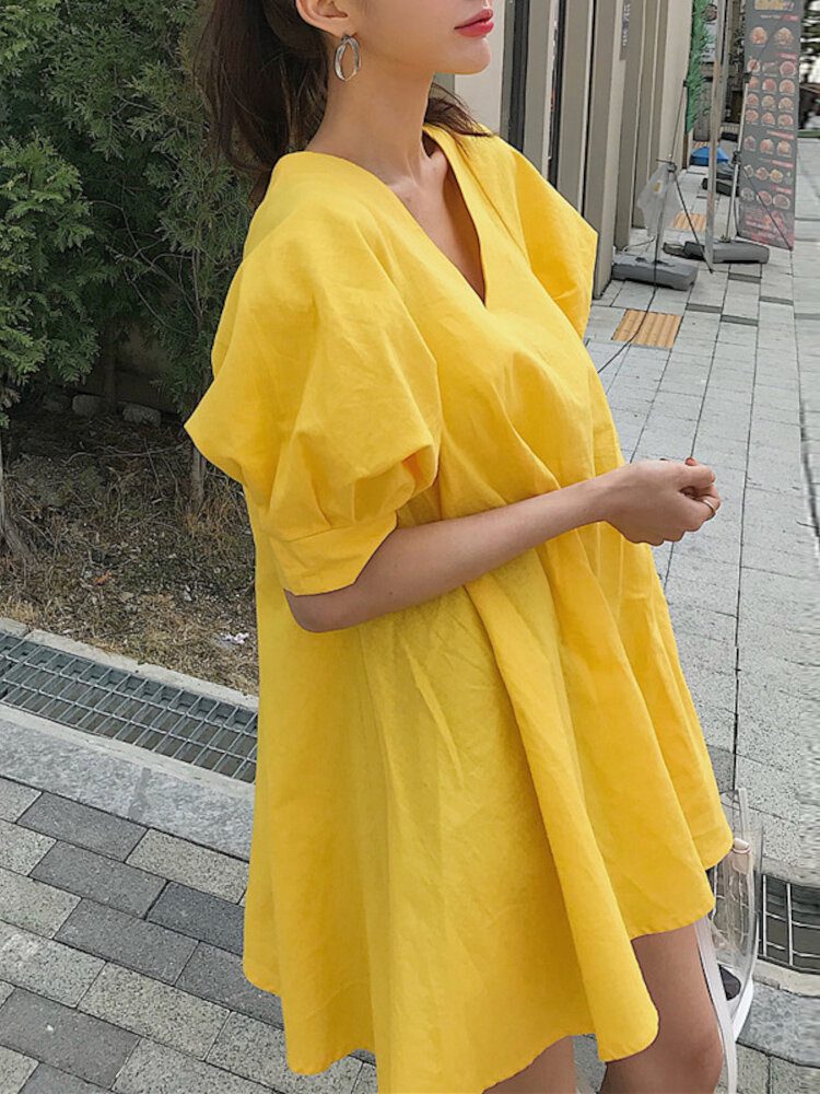 Puff Sleeve Solid Plissering Sommerferiekjole For Kvinner