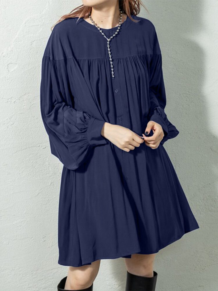 Puff Sleeve Stand Krage Langermet Plissert Casual Shirt Dress