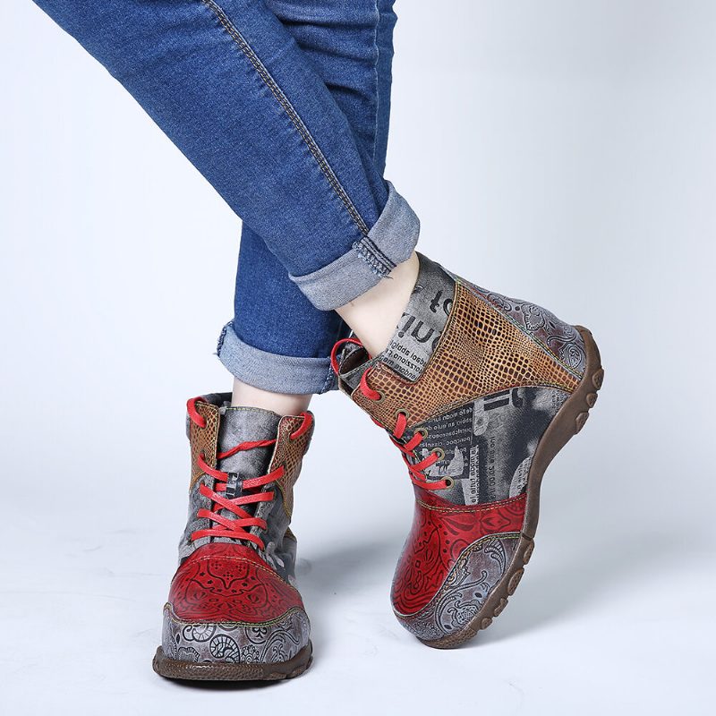 Retro Stort Hode Preget Ekte Skinn Skjøting Avismønster Flate Snørestøvler