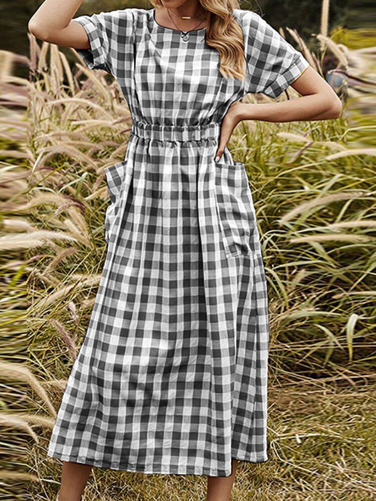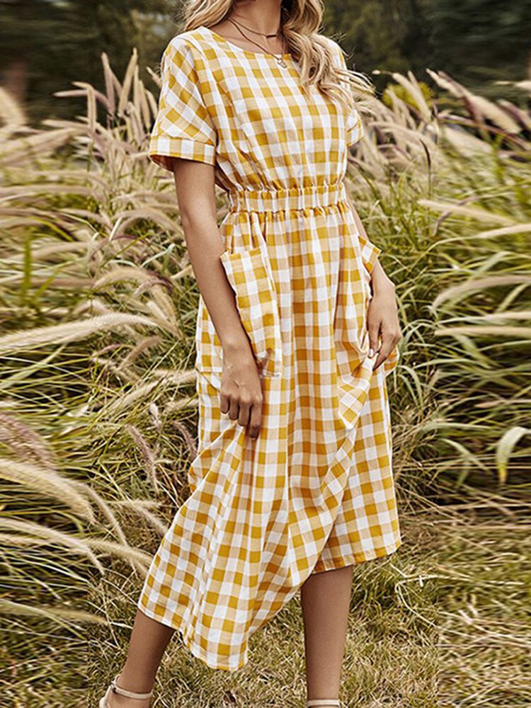 Ruttet Lomme Elastisk Midje Med Rund Hals Kortermet Midikjole