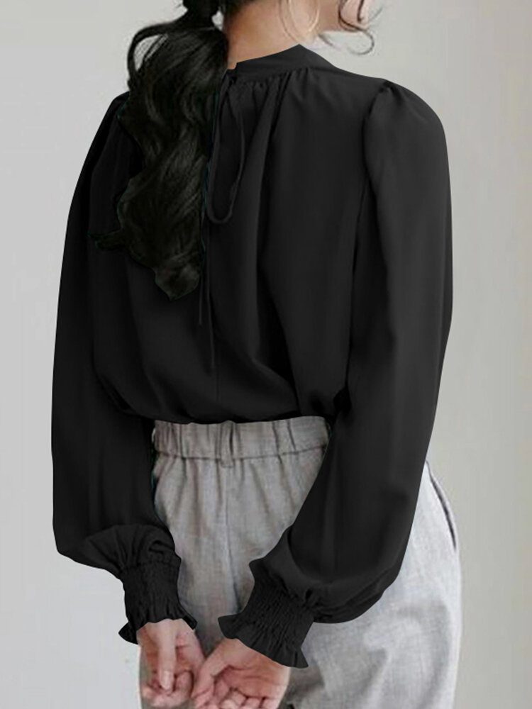 Solid Back Tie Rynket Pull Langermet Stand Collar Bluse