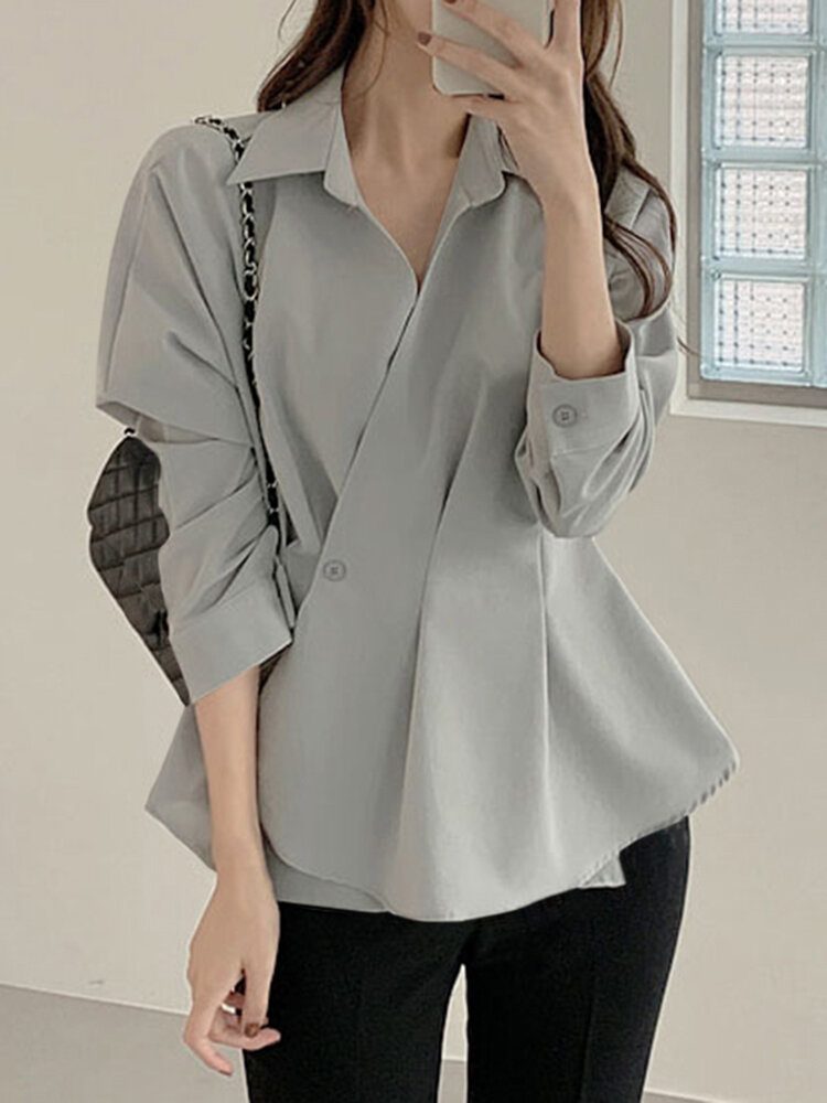 Solid Uregelmessig Knapp Lapel Langermet Bluse For Kvinner