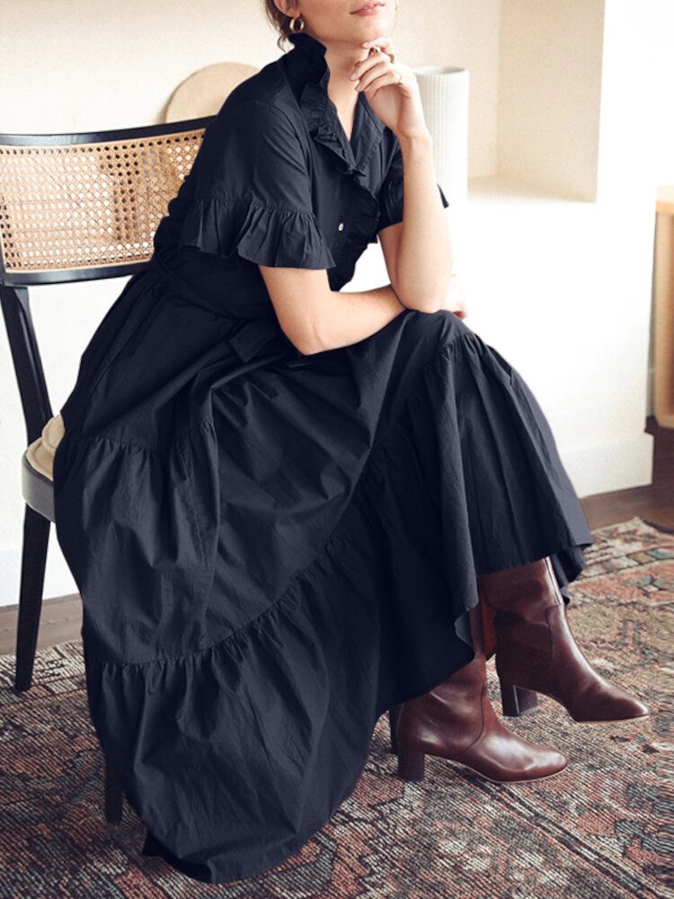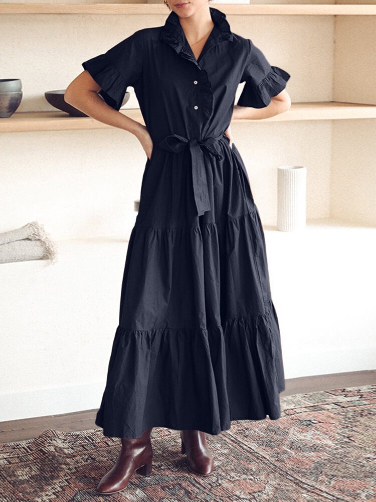 Uformell Ensfarget Jakkeslagskrage Knapp Med Belte Plissert Volanger Maxikjole