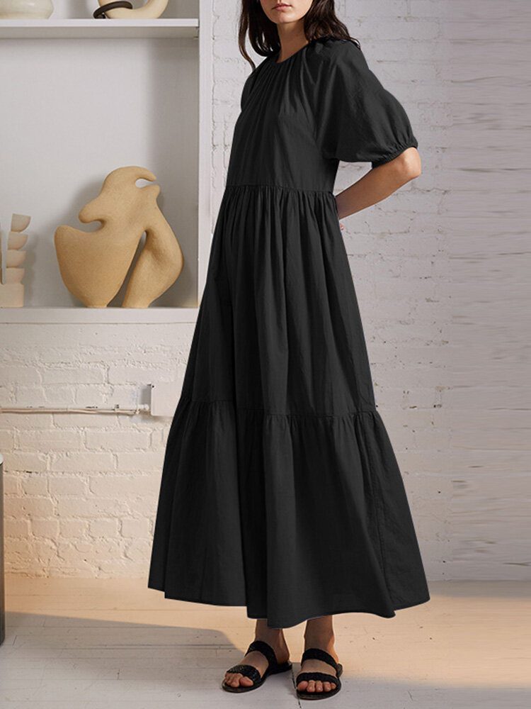 Uformell Løs Puffermer O-hals Plissert Knapp A-linje Maxikjole