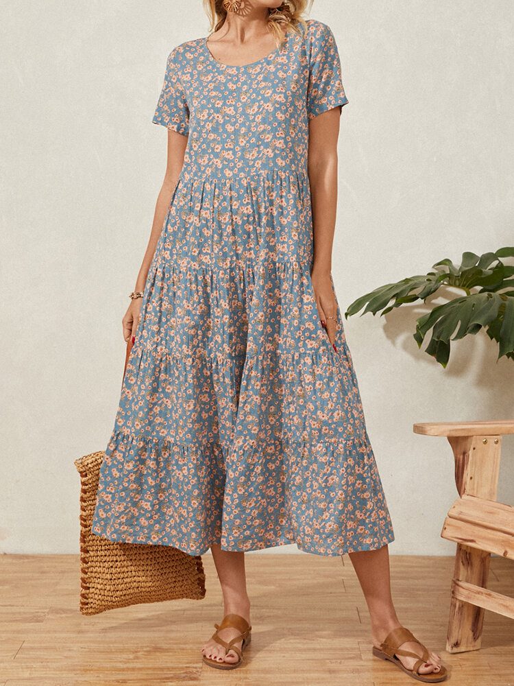 Uformelt Blomstertrykk Patchwork Kortermet Kortermet Plissert Ferie-maxikjole For Kvinner