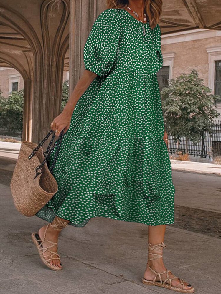 Uformelt Løst Blomstertrykk O-hals Puffermer Plissert A-linje Maxikjole